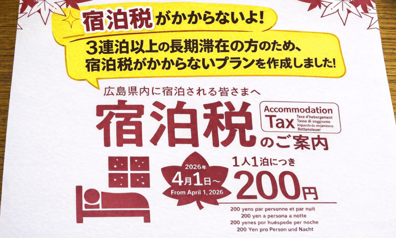2026年4月から導入された、広島県の宿泊税について簡単に説明します。この税は「観光の振興を図る施策に要する費用に充てる」とされており、観光資源の整備や受け入れ環境の向上に活用される予定です。